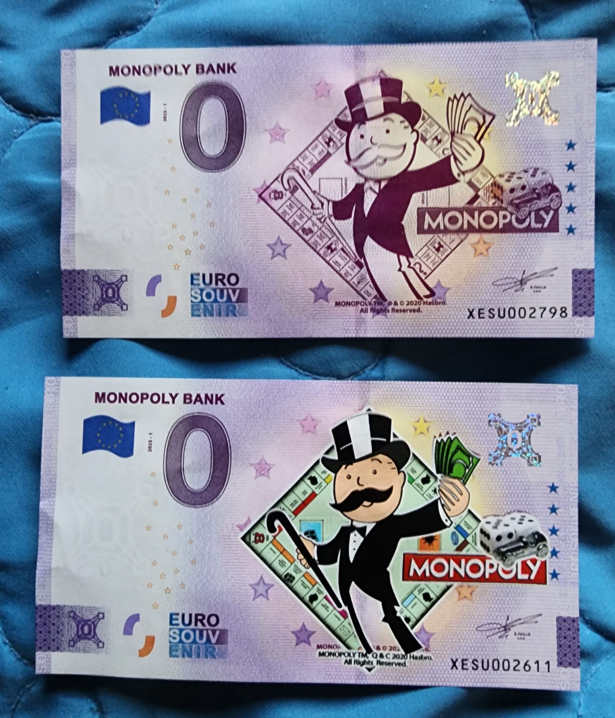 S34. Two “Monopoly Bank” Zero Euro Banknotes, 2023.